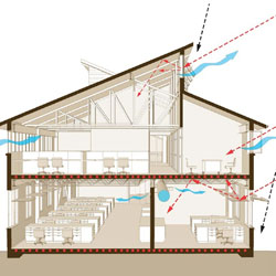 Khusus untuk ventilasi silang yang dibuat di bagian atas dan bawah, ventilasi yang berada di atas digunakan sebagai media pembuangan sedangkan yang ada di bawah untuk jalur masuk. Karena udara dalam ruang punya sifat yang lebih panas dibanding dengan diluar sehingga dapat mudah terdorong atau terbuang.