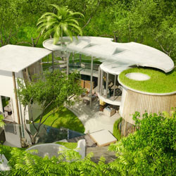 Yang paling menarik adalah, bagian yang berada disebelah kiri terdapat lubang yang digunakan sebagai tempat tumbuhnya pohon kelapa. Batang pohon ini berada di dalam ruang atau area bangunan, kemudian ditutup dengan suatu element yang bentuknya seperti spiral. Sedang bagian yang berada di atas atap, terlihat sebagian batang dan daun kealapa yang rimbun dan lebat.