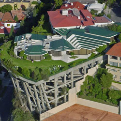 Sedangkan untuk bangunan utamanya, terletak di tengah rerimbunan pohan yang tinggi serta besar dan rimbun sehingga tidak mudah bagi orang luar untuk melihatnya secara jelas. Bangunan utamanya sendiri menggunakan warna coklat bata pada bagian dindingnya. Bagian pinggir atap yang berbentuk segitiga pelana kuda diberi menara kecil untuk pembuangan asap pembakaran dari alat penghangat ruang. Beberapa bangunan tambahan memakai konsep desain yang sama